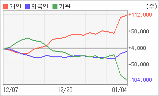 | 외국인과 기관은 순매도, 개인은 순매수(한달누적) 기관이 2일연속 주식을 팔고 있는 반면 외국인은 2일연속 주식을 사고 있다. 4주간을 기준으로 보면 외국인이 매도 후 매수의 관점을 보이고 있음에도 불구하고 8,556주를 순매도했고, 기관도 매도 관점으로 접근하면서 103,244주를 순매도했지만, 개인은 오히려 순매수량을 늘리며 111,800주를 순매수했다. |