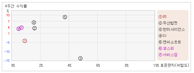 다음으로 업종과 시장을 비교해보면 GS가 속해 있는 코스피업종은 서비스업지수보다 변동성과 수익률이 모두 낮은 모습을 보여주고 있다. 다시 말해서 동업종의 탄력이 떨어지면서 업종상승률도 미진했다는 의미이다.