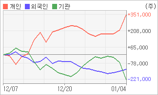 기관이 3일연속 주식을 팔고 있는 반면 외국인은 3일연속 주식을 사고 있다. 4주간을 기준으로 보면 외국인이 매도 우위를 지속하면서 129,846주를 순매도했고, 기관도 매도 관점으로 접근하면서 220,345주를 순매도했지만, 개인은 오히려 순매수량을 늘리며 350,191주를 순매수했다.