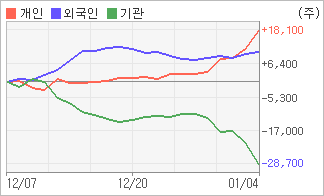 | 외국인/개인 순매수, 기관은 순매도(한달누적) 기관이 2일연속 주식을 팔고 있는 반면 외국인은 2일연속 주식을 사고 있다. 4주간을 기준으로 보면 외국인이 초반에 동종목을 순매수한 이후에 기세를 이어가며 10,520주를 순매수했고, 개인들도 순매수량을 늘리며 18,089주를 순매수했다. 하지만 기관은 매도 관점으로 접근하면서 28,609주를 순매도했다. |