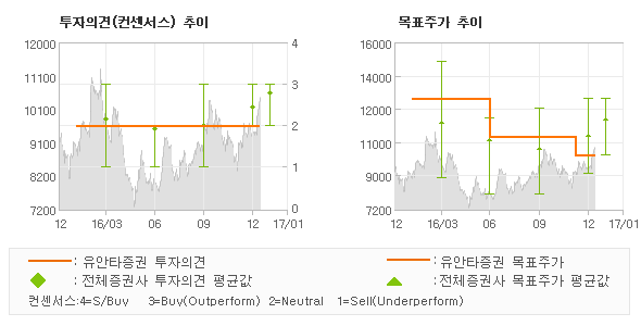 | 의견제시일자 | 증권사 | 투자의견 | 목표가 | | 20170110 | 유안타증권 | HOLD(유지) | 10,000 | | 20170110 | 한국투자증권 | 매수(상향) | 13,000 | | 20170109 | 삼성증권 | 매수 | 11,200 | | 20170109 | 하이투자증권 | 매수(상향) | 13,000 |