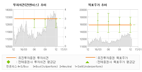 | 의견제시일자 | 증권사 | 투자의견 | 목표가 | | 20170110 | 유진투자증권 | 매수(유지) | 16,000 | | 20161222 | 대신증권 | 매수(유지) | 17,000 | | 20161208 | KB증권 | 매수(유지) | 17,000 | | 20161121 | 메리츠종금증권 | 매수 | 16,000 |