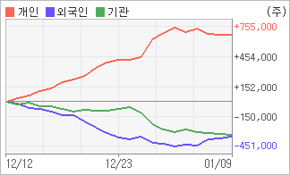 | 외국인과 기관은 순매도, 개인은 순매수(한달누적) 기관이 4일연속 주식을 팔고 있는 반면 외국인은 3일연속 주식을 사고 있다. 4주간을 기준으로 보면 외국인이 매도 후 매수의 관점을 보이고 있음에도 불구하고 350,896주를 순매도했고, 기관도 매도 관점으로 접근하면서 330,124주를 순매도했지만, 개인은 오히려 순매수량을 늘리며 681,020주를 순매수했다. |