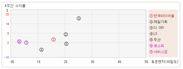 다음으로 업종과 시장을 비교해보면 한국타이어월드와이드가 속해 있는 코스피업종은 서비스업지수보다 변동성은 낮고, 수익률은 높은 모습을 보여주고 있다. 따라서 코스피업종에 투자하고 있다면 지수대비 안전하면서도 높은 상승률을 기록하고 있는 것이다.