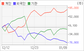 1월4일부터 전일까지 외국인이 4거래일 연속 순매도했다. 4주간을 기준으로 보면 외국인이 매도 우위를 지속하면서 76,833주를 순매도했고, 기관도 매도 우위를 보이면서 10,022주를 순매도했지만, 개인은 오히려 순매수량을 늘리며 86,855주를 순매수했다.