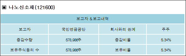 나노신소재(121600)는 10일 주주 국민연금공단을 비롯한 특별관계자의 보유주식이 증가되었다고 발표했다. 이는 직전 보고일보다 578,986주 증가하여 지분율은 5.34%로 상승했다. 이번 보고 사유는 단순추가취득/처분으로 알려졌다.