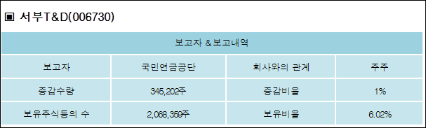 서부T&D(006730)는 10일 주주 국민연금공단을 비롯한 특별관계자의 보유주식이 증가되었다고 발표했다. 이는 직전 보고일보다 345,202주 증가하여 지분율은 6.02%로 상승했다. 이번 보고 사유는 단순추가취득/처분으로 알려졌다.