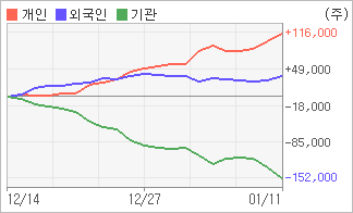 | 외국인/개인 순매수, 기관은 순매도(한달누적) 기관이 3일연속 주식을 팔고 있는 반면 외국인은 2일연속 주식을 사고 있다. 4주간을 기준으로 보면 외국인이 매수 우위를 유지하면서 36,274주를 순매수했고, 개인들도 순매수량을 늘리며 115,187주를 순매수했다. 하지만 기관은 매도 관점으로 접근하면서 151,461주를 순매도했다. |