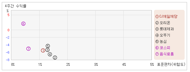 | 롯데제과 | 1.3% | -6.8% | -5.1 |