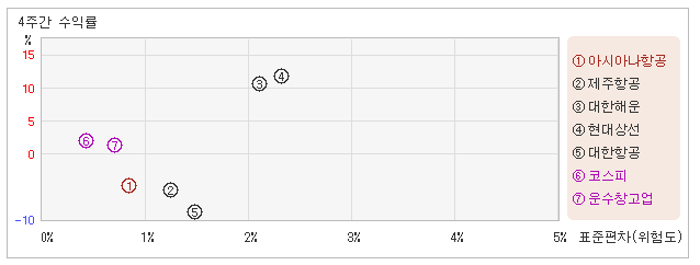 다음으로 업종과 시장을 비교해보면 아시아나항공이 속해 있는 운수창고업업종은 코스피지수보다 변동성은 높고, 수익률은 낮은 모습을 보여주고 있다. 다시 말해서 동업종은 지수보다 크게 오르락 내리락 했지만, 상승률은 오히려 지수보다 못하다는 의미이다.