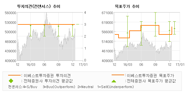 | 의견제시일자 | 증권사 | 투자의견 | 목표가 | | 20170112 | 이베스트투자증권 | 매수(유지) | 590,000 | | 20170112 | 유안타증권 | 매수(유지) | 620,000 | | 20170111 | BNK투자증권 | 매수(유지) | 550,000 | | 20170109 | 케이프투자증권 | 매수(유지) | 550,000 |