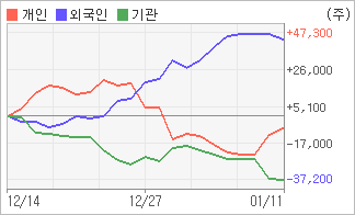 | 기관과 개인은 순매도, 외국인은 순매수(한달누적) 1월3일부터 전일까지 기관이 7거래일 연속 동종목을 내다 팔았다. 4주간을 기준으로 보면 외국인이 초반에 동종목을 순매수한 이후에 기세를 이어가며 44,131주를 순매수한 반면, 기관은 매도 관점으로 접근하면서 37,174주를 순매도했고, 개인들도 매도 우위로 반전되면서 6,957주를 순매도한 것으로 집계됐다. |