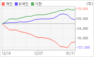 | 외국인/기관 순매수, 개인은 순매도(한달누적) 1월9일부터 전일까지 외국인이 3거래일 연속 순매도했다. 4주간을 기준으로 보면 외국인이 매수 우위를 유지하면서 20,690주를 순매수했고, 기관도 방향성있는 매매를 하면서 74,361주를 순매수했다. 반면 개인들은 매도쪽으로 방향을 잡으면서 95,051주를 순매도한 것으로 나타났다. |