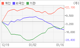 | 외국인과 기관은 순매도, 개인은 순매수(한달누적) 1월4일부터 외국인들이 9거래일 연속 순매도 행진을 벌이고 있다. 4주간을 기준으로 보면 외국인이 순매도로 돌아서면서 11,901주를 순매도했고, 기관도 매도 우위를 보이면서 8,010주를 순매도했지만, 개인은 오히려 순매수량을 늘리며 19,911주를 순매수했다. |