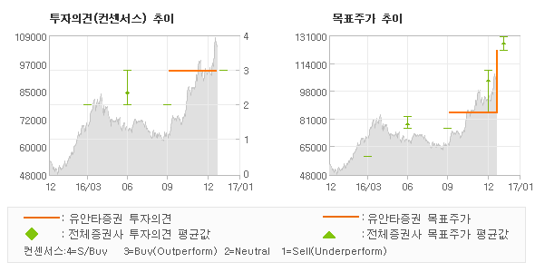 | 의견제시일자 | 증권사 | 투자의견 | 목표가 | | 20170117 | 유안타증권 | 매수(유지) | 122,000 | | 20170109 | 케이프투자증권 | 매수(유지) | 130,000 | | 20161202 | 삼성증권 | 매수 | 105,000 | | 20161115 | 하나금융투자 | 매수 | 106,000 |
