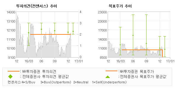 | 의견제시일자 | 증권사 | 투자의견 | 목표가 | | 20170117 | NH투자증권 | HOLD(유지) | 8,500 | | 20170117 | 동부증권 | HOLD(유지) | 10,000 | | 20170117 | 한국투자증권 | 매수(유지) | 15,000 | | 20161206 | 이베스트투자증권 | HOLD(유지) | 12,500 |