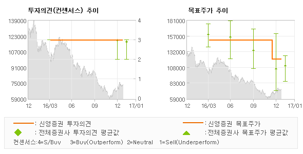 | 의견제시일자 | 증권사 | 투자의견 | 목표가 | | 20170118 | 신영증권 | 매수(유지) | 120,000 | | 20170117 | 이베스트투자증권 | 매수(유지) | 125,000 | | 20170117 | 하이투자증권 | 매수(유지) | 115,000 | | 20170117 | 한국투자증권 | 매수(유지) | 103,000 |