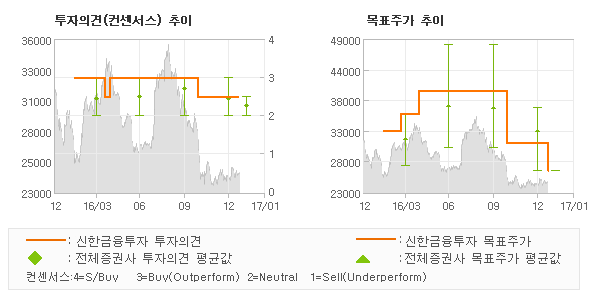 | 의견제시일자 | 증권사 | 투자의견 | 목표가 | | 20170118 | 신한금융투자 | TRADING BUY(유지) | 26,000 | | 20170103 | KB증권 | MARKETPERFORM | 26,000 | | 20161130 | KB증권(구KB투자) | HOLD(유지) | 26,000 | | 20161028 | 키움증권 | 매수(유지) | 36,000 |