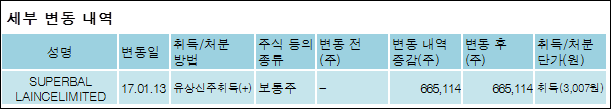 포스링크(056730)는 18일 최대주주 SUPERBALLAINCELIMITED의 보유주식이 증가되었다고 발표했다. 이는 직전 보고일보다 665,114주 증가하여 지분율은 7.96%로 상승했다. 이번 보고 사유는 제3자배정유상증자신주취득으로 알려졌다.