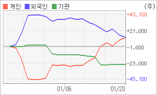 | 외국인/개인 순매수, 기관은 순매도(한달누적) 1월20일부터 전일까지 외국인이 2거래일 연속 순매도했다. 4주간을 기준으로 보면 외국인이 매수 우위를 유지하면서 12,389주를 순매수했고, 개인들도 매수반전의 모습을 보이며 11,900주를 순매수했다. 하지만 기관은 매도 관점으로 접근하면서 24,289주를 순매도했다. |