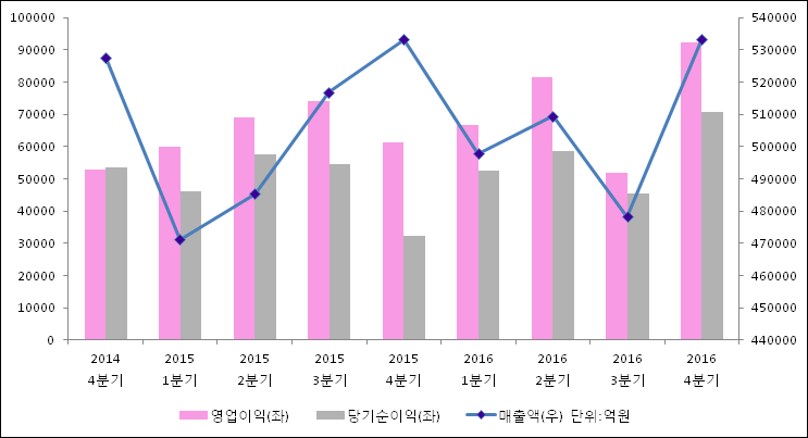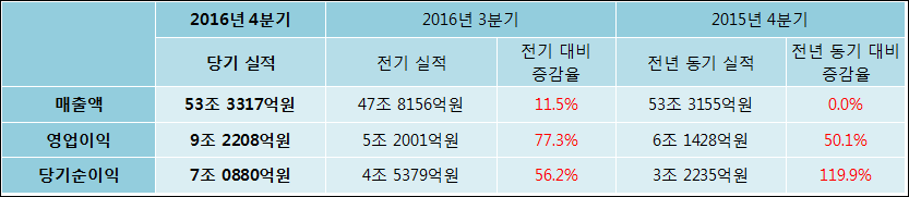 01월 24일 삼성전자(005930)의 2016년 4분기 연결 잠정 실적이 발표됐다. 작년 같은 기간 대비해서 매출액, 영업이익, 당기순이익 모두 증가하였다. 53조 3155억원이었던 매출액은 0.03% 증가하여 53조 3317억원을 기록했다. 영업이익은 50.11% 상승하여 9조 2208억원이고, 당기순이익은 7조 0880억원으로 발표됐다.