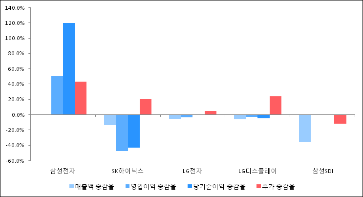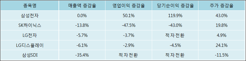 다음은 삼성전자와 동일 업종 내 비교 그룹 종목의 각각 최근 실적의 전년 동기 대비 성장률이다. 삼성전자의 매출액 증감율은 타 종목 대비 가장 우수한 편이다. 그리고 주가는 가장 높은 상승률을 보였다.