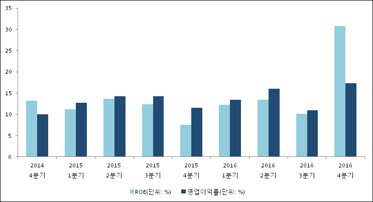삼성전자의 자기자본이익률(ROE)은 30.8%로 나타났다. 이는 최근 일년과 비교했을 때 급등한 수치이다. 4분기 자기자본은 하락하고 당기순이익이 상승하였기 때문이다. 전년 동기인 2015년 4분기 ROE는 7.5%로 이번 분기에 23.3%p 상승했다.영업이익률은 17.3%이다. 지난해 동기 영업이익률은 11.5%로 이번 4분기가 5.8%p 상승했다.