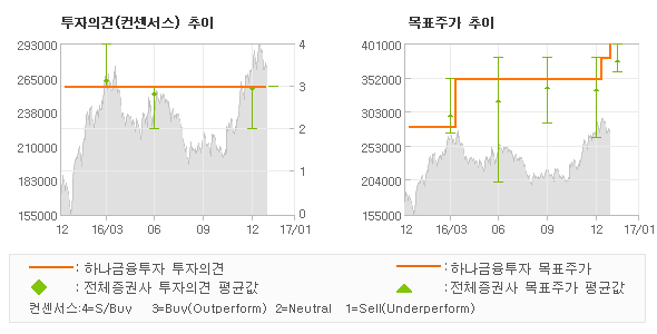 | 의견제시일자 | 증권사 | 투자의견 | 목표가 | | 20170124 | 하나금융투자 | 매수 | 400,000 | | 20170112 | 신한금융투자 | 매수 | 360,000 | | 20170111 | 케이프투자증권 | 매수(유지) | 370,000 | | 20170111 | 메리츠종금증권 | 매수 | 370,000 |