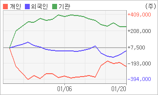 | 외국인과 개인은 순매도, 기관은 순매수(한달누적) 1월20일부터 전일까지 외국인이 2거래일 연속 순매수를 보였다. 4주간을 기준으로 보면 기관이 초반에 동종목을 순매수한 이후에 최근에는 순매수량이 줄어들고 있음에도 불구하고 264,932주를 순매수한 반면, 외국인은 매도 후 매수의 관점을 보이고 있음에도 불구하고 35,666주를 순매도했고, 개인들도 초반에 동종목을 순매도한 이후에 근래에는 순매도량을 줄이면서 229,266주를 순매도했다. |