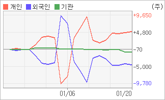 | 외국인과 기관은 순매도, 개인은 순매수(한달누적) 1월20일부터 전일까지 기관이 2거래일 연속 순매도를 보였다. 4주간을 기준으로 보면 외국인이 매도 우위를 지속하면서 4,387주를 순매도했고, 기관도 순매수에서 순매도로 반전되면서 768주를 순매도했지만, 개인은 오히려 순매수량을 늘리며 5,155주를 순매수했다. |