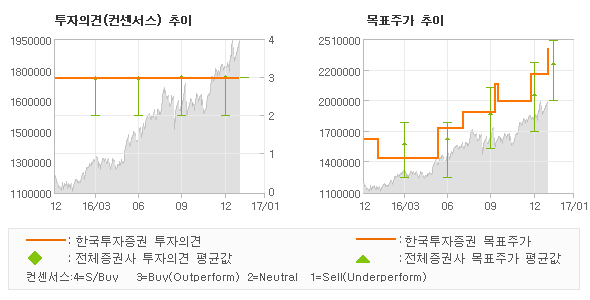 | 의견제시일자 | 투자의견 | 목표가격 | | 20170125 | 매수(유지) | 2,420,000 | | 20170109 | 매수(유지) | 2,200,000 | | 20161221 | 매수(유지) | 2,200,000 | | 20161130 | 매수(유지) | 1,950,000 | | 20161129 | 매수(유지) | 1,950,000 |