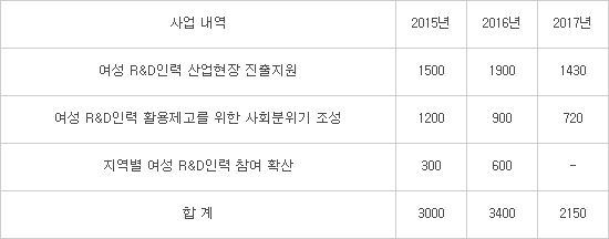 이에 따라 여성 R&D인력 산업참여를 위한 지원확대가 절실하지만 여성 R&D인력 지원 예산은 오히려 깎였다. KIAT에 따르면 올해 산업현장 여성 R&D인력 참여확산 기반구축사업에 배정된 예산은 21억5000만원으로 지난해 34억원보다 12억5000만원 줄었다.