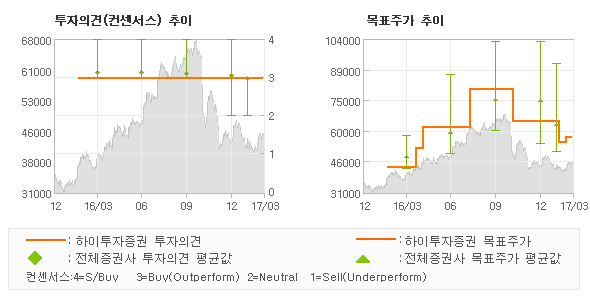 | 의견제시일자 | 증권사 | 투자의견 | 목표가 | | 20170303 | 하이투자증권 | 매수(유지) | 57,000 | | 20170302 | 미래에셋대우 | 매수(유지) | 62,000 | | 20170221 | 키움증권 | OUTPERFORM(MAINTAIN) | 50,000 | | 20170221 | 케이프투자증권 | 매수(유지) | 59,000 |