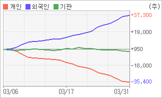 | 기관과 개인은 순매도, 외국인은 순매수(한달누적) 기관이 2일연속 주식을 팔고 있는 반면 외국인은 21일연속 주식을 사고 있다. 4주간을 기준으로 보면 외국인이 초반에 동종목을 순매수한 이후에 기세를 이어가며 37,286주를 순매수한 반면, 기관은 순매수에서 순매도로 반전되면서 1,954주를 순매도했고, 개인들도 매도쪽으로 방향을 잡으면서 35,332주를 순매도한 것으로 집계됐다. |