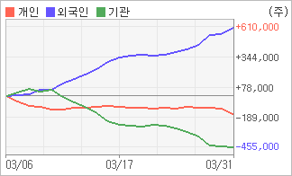 | 기관과 개인은 순매도, 외국인은 순매수(한달누적) 기관이 7일연속 주식을 팔고 있는 반면 외국인은 7일연속 주식을 사고 있다. 4주간을 기준으로 보면 외국인이 초반에 동종목을 순매수한 이후에 기세를 이어가며 609,412주를 순매수한 반면, 기관은 매도 관점으로 접근하면서 454,189주를 순매도했고, 개인들도 매도쪽으로 방향을 잡으면서 155,223주를 순매도한 것으로 집계됐다. |