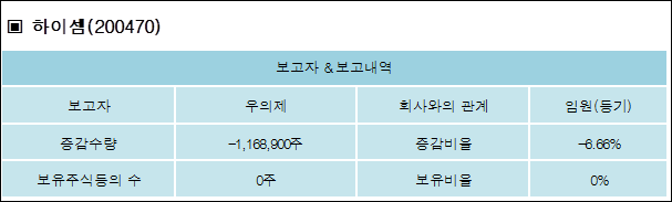 하이셈(200470)은 03일 임원(등기) 우의제를 비롯한 특별관계자의 보유주식이 감소되었다고 발표했다. 이는 직전 보고일보다 1,168,900주 감소하여 지분율은 0%로 하락했다. 이번 보고 사유는 주식양수도계약(2017.02.14.)종결으로 알려졌다.