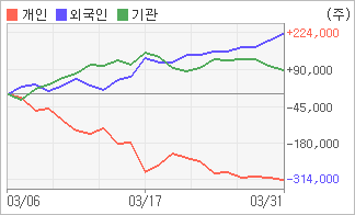 | 외국인/기관 순매수, 개인은 순매도(한달누적) 기관이 3일연속 주식을 팔고 있는 반면 외국인은 6일연속 주식을 사고 있다. 4주간을 기준으로 보면 외국인이 초반에 동종목을 순매수한 이후에 기세를 이어가며 223,756주를 순매수했고, 기관도 초반에 동종목을 순매수한 이후에 최근에는 순매수량이 줄어들고 있음에도 불구하고 89,753주를 순매수했다. 반면 개인들은 매도쪽으로 방향을 잡으면서 313,509주를 순매도한 것으로 나타났다. |