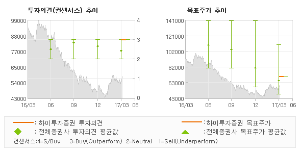 | 의견제시일자 | 증권사 | 투자의견 | 목표가 | | 20170403 | 하이투자증권 | 매수(신규) | 70,000 | | 20170322 | 이베스트투자증권 | HOLD(MAINTAIN) | 55,000 | | 20170306 | IBK투자증권 | 매수(상향) | 70,000 | | 20170227 | 바로투자증권 | 매수(유지) | 110,000 |