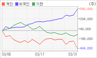 | 기관과 개인은 순매도, 외국인은 순매수(한달누적) 3월30일부터 전일까지 외국인이 2거래일 연속 순매수를 보였다. 4주간을 기준으로 보면 외국인이 초반에 동종목을 순매수한 이후에 기세를 이어가며 539,241주를 순매수한 반면, 기관은 순매수에서 순매도로 반전되면서 96,096주를 순매도했고, 개인들도 매도쪽으로 방향을 잡으면서 443,145주를 순매도한 것으로 집계됐다. |
