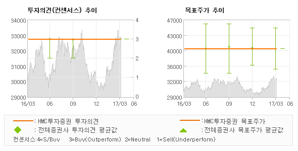 | 의견제시일자 | 증권사 | 투자의견 | 목표가 | | 20170404 | HMC투자증권 | 매수 | 40,000 | | 20170328 | KTB투자증권 | 매수 | 42,000 | | 20170328 | 이베스트투자증권 | 매수(유지) | 38,000 | | 20170327 | 대신증권 | 매수(유지) | 40,000 |