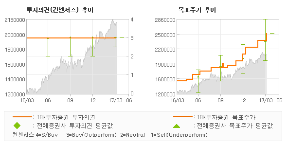 | 의견제시일자 | 증권사 | 투자의견 | 목표가 | | 20170404 | IBK투자증권 | 매수(유지) | 2,550,000 | | 20170330 | NH투자증권 | 매수(유지) | 2,600,000 | | 20170330 | 메리츠종금증권 | 매수 | 2,720,000 | | 20170330 | 삼성증권 | 매수 | 2,500,000 |
