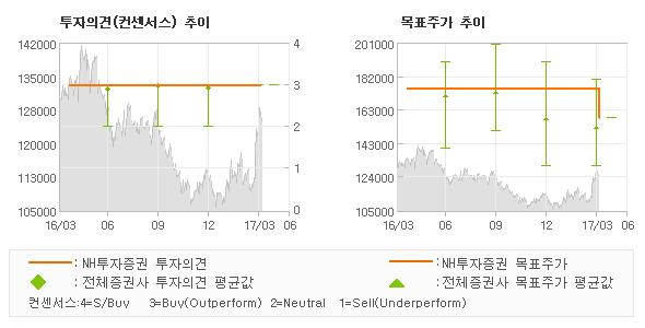 | 의견제시일자 | 증권사 | 투자의견 | 목표가 | | 20170404 | NH투자증권 | 매수(유지) | 158,000 | | 20170331 | 한화투자증권 | 매수(유지) | 150,000 | | 20170330 | 대신증권 | 매수(유지) | 176,000 | | 20170324 | 삼성증권 | 매수 | 145,000 |