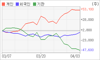 | 외국인과 기관은 순매도, 개인은 순매수(한달누적) 기관이 6일연속 주식을 팔고 있는 반면 외국인은 3일연속 주식을 사고 있다. 4주간을 기준으로 보면 외국인이 매도 후 매수의 관점을 보이고 있음에도 불구하고 3,468주를 순매도했고, 기관도 매도 관점으로 접근하면서 47,572주를 순매도했지만, 개인은 오히려 순매수량을 늘리며 51,040주를 순매수했다. |