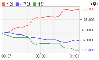 | 외국인과 기관은 순매도, 개인은 순매수(한달누적) 전일 외국인이 4,612주를 순매도했다. 4주간을 기준으로 보면 외국인이 매도 우위를 지속하면서 89,771주를 순매도했고, 기관도 매도 관점으로 접근하면서 217,227주를 순매도했지만, 개인은 오히려 순매수량을 늘리며 306,998주를 순매수했다. |