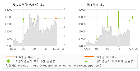 | 의견제시일자 | 증권사 | 투자의견 | 목표가 | | 20170405 | SK증권 | 매수(유지) | 33,000 | | 20170404 | 이베스트투자증권 | 매수(유지) | 35,000 | | 20170202 | 미래에셋대우 | 매수(유지) | 31,000 |