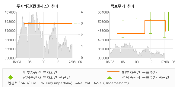 | 의견제시일자 | 증권사 | 투자의견 | 목표가 | | 20170405 | NH투자증권 | 매수(유지) | 460,000 | | 20170403 | 신영증권 | 매수(유지) | 500,000 | | 20170403 | 동부증권 | 매수 | 550,000 | | 20170330 | 키움증권 | 매수(유지) | 510,000 |