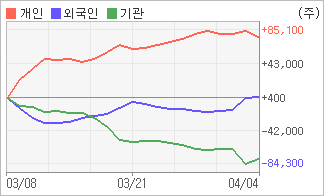 | 외국인/개인 순매수, 기관은 순매도(한달누적) 3월30일부터 전일까지 외국인이 4거래일 연속 순매수를 보였다. 4주간을 기준으로 보면 외국인이 매매관점을 매도에서 매수로 전환하면서 919주를 순매수했고, 개인들도 순매수량을 늘리며 76,654주를 순매수했다. 하지만 기관은 매도 관점으로 접근하면서 77,573주를 순매도했다. |