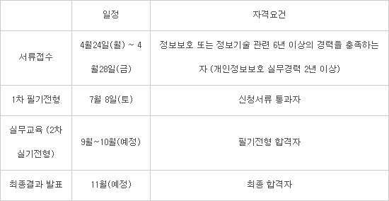 올해 자격검정에는 인증심사원이 갖춰야 할 개인정보 생명주기, 법적 요구사항 등 인증심사에 필요한 기본 역량을 평가하기 위해 필기시험이 신설됐다. 인증심사원으로 선발되기 위해서는 4년제 졸업자 기준 개인정보보호 실무 경력 2년 이상을 포함한 정보기술 또는 정보보호 관련 6년 이상 경력을 충족하는 자격을 갖춰야 한다.