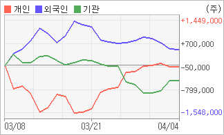 | 기관과 개인은 순매도, 외국인은 순매수(한달누적) 기관이 3일연속 순매수를 보이고 있는 반면에 외국인은 4일연속 순매도를 보이고 있다. 4주간을 기준으로 보면 외국인이 매수 우위를 유지하면서 514,946주를 순매수한 반면, 기관은 순매수에서 순매도로 반전되면서 484,720주를 순매도했고, 개인들도 초반에 동종목을 순매도한 이후에 근래에는 순매도량을 줄이면서 30,226주를 순매도한 것으로 집계됐다. |