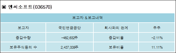 엔씨소프트(036570)는 05일 주주 국민연금공단을 비롯한 특별관계자의 보유주식이 감소되었다고 발표했다. 이는 직전 보고일보다 462,632주 감소하여 지분율은 11.11%로 하락했다. 이번 보고 사유는 단순추가취득/처분으로 알려졌다.